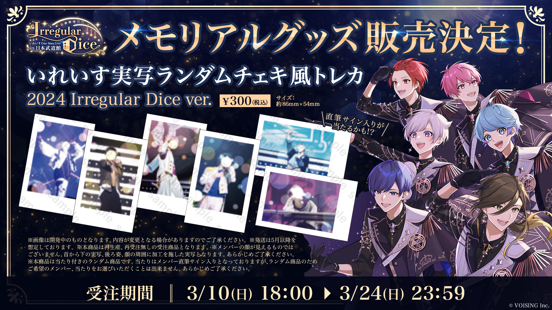 🎲いれいす武道館ライブのメモリアルグッズが発売決定!🎲 2024.03.03 グッズ いれいす日本武道館ライブ大成功を記念して、ライブシーンを使用した実写ランダムチェキ風トレカの販売が決定🎉当たりはメンバーの直筆サイン入り!🎲受注受付期間 3/10(日)18:00~3/24(日)23:59詳細は画像をチェック✅ BACK TO LIST