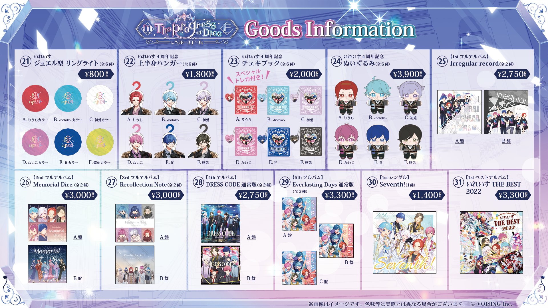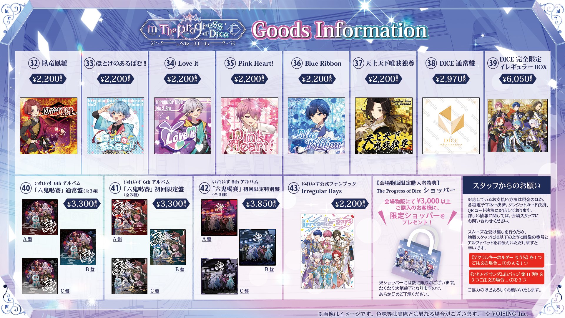 🎲いれいすベルーナドーム 現地販売の実施が決定🎲 2024.11.14 ライブグッズ ■販売時間 Day1:11:00〜終演後30分から1時間程度Day2:10:00〜終演後30分から1時間程度会場物販にて¥3,000以上ご購入のお客様に、限定ショッパーをプレゼント✨ ※特典はなくなり次第終了です 詳細は画像をチェック! BACK TO LIST